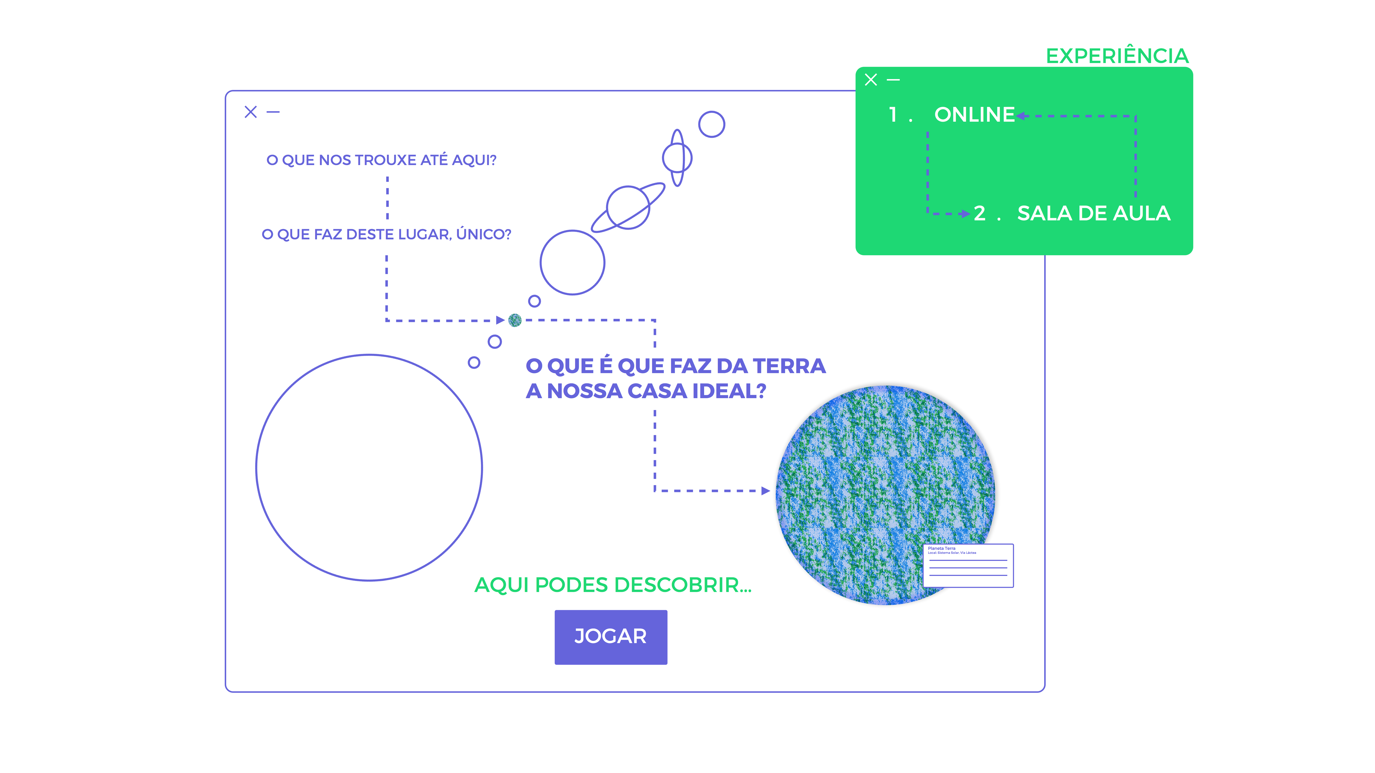 At first, players access didactic content as they go through the several levels of the game. This self-sufficient platform will provide access to all the content needed to replicate the experience completely, anytime, anywhere. In a more advanced phase, the experience is transported to the real world, where players are proposed to form groups in a face-to-face session guided by a moderator. While the online side of the platform allows for the acquisition of knowledge through digital means, the offline side al-lows for a more consolidated learning experience among peers in a playful, participatory and inclusive way. The goal is to promote a discussion among participants, about the measures that can be taken to minimize the impact that man has exerted on Earth.